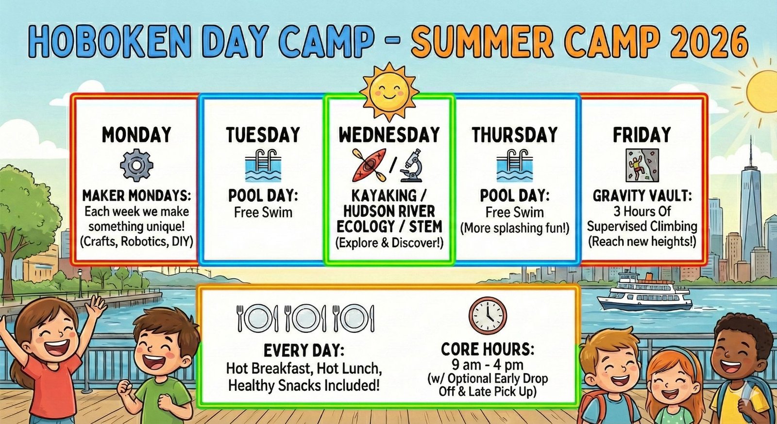The Hoboken Adventurer’s Day Camp, designed for kids aged 4 to 14, offers fun-filled activities during all major holidays. Hosted at Play! Hoboken and nearby locations, the camp runs from 9 AM to 4 PM, with optional early drop-off (8 AM) and late pickup (6 PM).